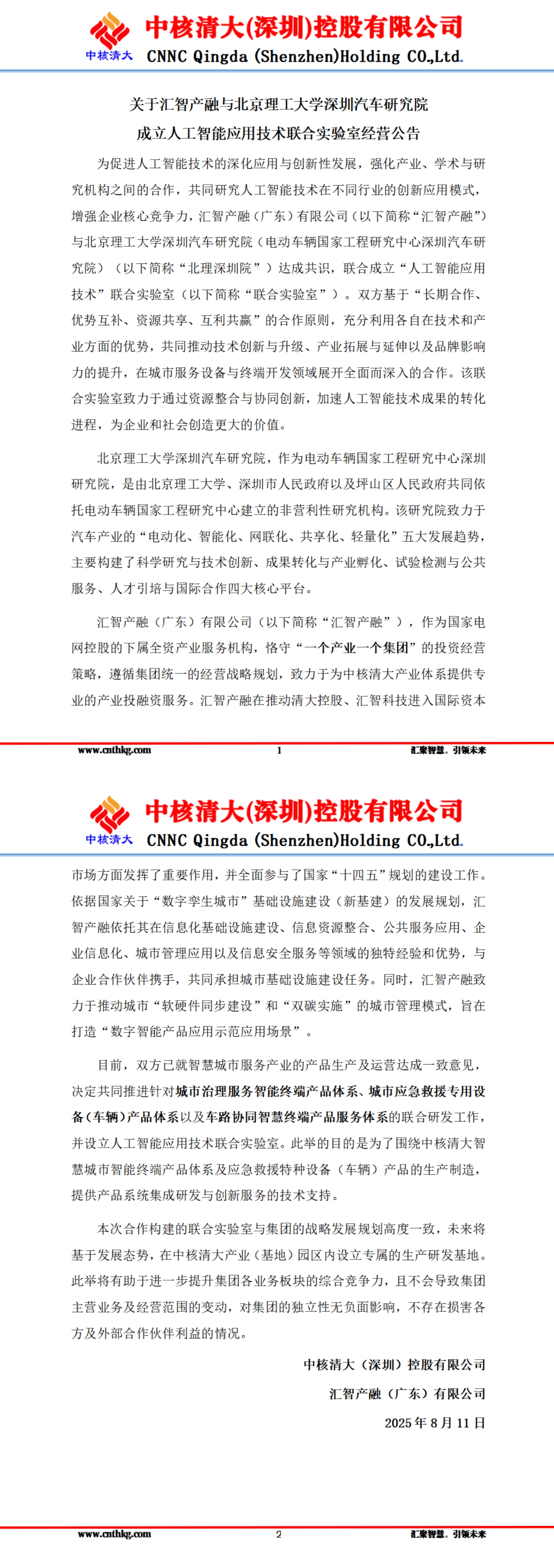 关于汇智产融与北京理工大学深圳汽车研究院 成立人工智能应用技术联合实验室经营公告